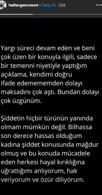 Bu açıklamasından dolayı tepki çeken Halit Ergenç, Instagram hesabından yeni bir açıklama yaparak "Yargı süreci devam eden ve beni çok üzen bir konuyla ilgili sadece bir temenni niyetiyle yaptığım açıklama, kendimi doğru ifade edemememden dolayı maksadını çok aştı. Bundan dolayı çok üzgünüm. Şiddetin hiçbir türünün yanında olmam mümkün değil. Bilhassa son derece hassas olduğum kadına şiddet konusunda mağdur olmuş ve bu konuda mücadele eden herkesi hayal kırıklığına uğrattığımı anlıyorum, hak veriyorum özür diliyorum" sözleriyle geri adım atmıştı.