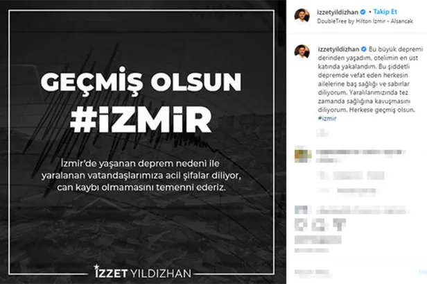 Sosyal medya hesabından yayınladığı mesajda ise şarkıcı, "Bu büyük depremi derinden yaşadım, otelimin en üst katında yakalandım. Bu şiddetli depremde vefat eden herkesin ailelerine baş sağlığı ve sabırlar diliyorum. Yaralılarımızında tez zamanda sağlığına kavuşmasını diliyorum. Herkese geçmiş olsun" ifadelerini kullandı.