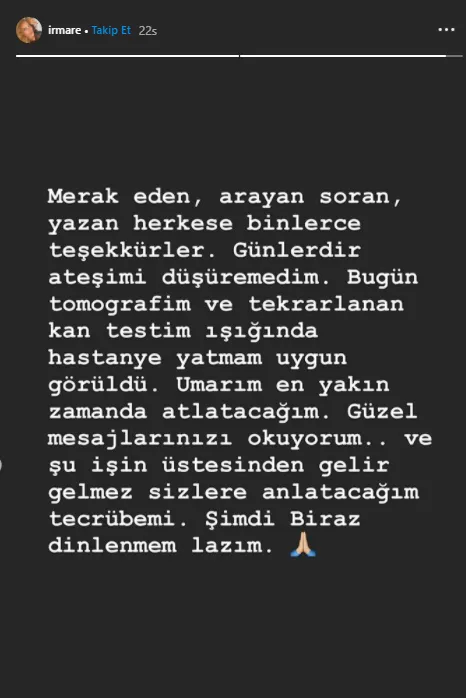Geçtiğimiz günlerde koronavirüse yakalandığını açıklayan Irmak Ünal yeni bir paylaşım yaptı ve sağlık durumuyla ilgili bilgi verdi. Bir süredir evde tedavi gören Ünal yaptığı son paylaşımda ateşinin düşmediği için hastaneye yattığını açıkladı.