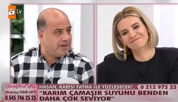 atv ekranlarında hafta içi her gün izleyici karşısına Esra Erol'da programında başta Esra Erol olmak üzere tüm Türkiye bir ilke şahitlik etti. Esra Erol'un canlı yayına katılan Hasan Güneş, eşi Fatma Güneş hakkında öyle açıklamalarda bulundu ki şaşıp kalmamak elde değil. Esra Erol'da 26 yıllık evli olan Hasan Güneş, eşi Fatma Güneş'in, çamaşır suyu ve sarı bezi kendisinden daha çok sevdiğini iddia etti. 3 çocuğunu da alıp evi terk eden Fatma Güneş, Esra Erol'da eşi Hasan Güneş ile karşı karşıya geldi. Eşi Fatma Güneş’in çok titiz olduğunu ve her gün kapı kollarını temizlediğini söyledi. Eşime temizlik yaptırmadığım bir günde ise sabaha kadar ağladığını dile getirerek büyük miktar su israf oluyor dedi. Bu durumda eşi ile aralarına temizlik giren adam ekran başındakilerin şaşkın bakışları ile canlı yayında gündem oldu. İşte haberin tüm detayları…