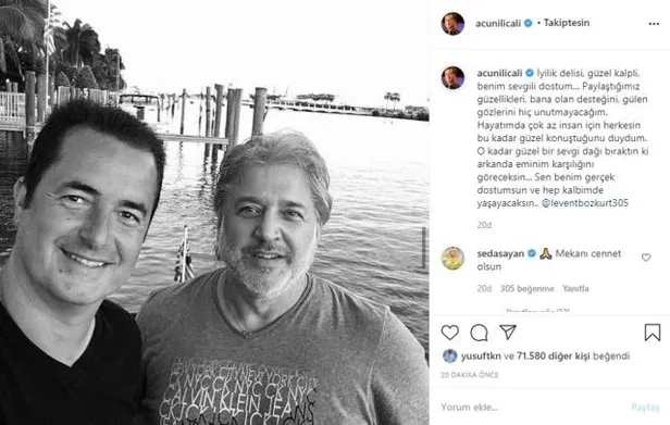 Acun Ilıcalı'yı kahreden ölüm! Dost acısı çeken Acun Ilıcalı, Levent Bozkur'u kaybetti. Duyduğu derin üzüntüyü kelimelere döken Acun Ilıcalı'nın Instagram paylaşımını okuyanlar, ünlü ismin acısını paylaştı. Seda Sayan da o isimler arasında yer aldı. Cümlesine, "İyilik delisi, güzel kalpli, benim sevgili dostum..." şeklinde başlayan Acun Ilıcalı'nın arkadaşı Levent Bozkurt neden öldü? İşte detaylar...