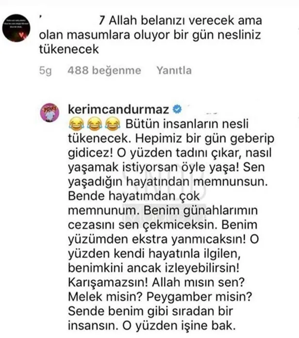 Bu yorum sonrası adeta çılgına dönen Durmaz, "Bütün insanların nesli tükenecek. Hepimiz bir gün geberip gideceğiz! O yüzden tadını çıkar, nasıl yaşamak istiyorsan öyle yaşa! Sen yaşadığın hayatından memnunsun. Bende hayatımdan çok memnunum. Benim günahlarımın cezasını sen çekmeyeceksin. Benim yüzümden ekstra yanmayacaksın! O yüzden kendi hayatınla ilgilen, benimkini ancak izleyebilirsin! Karışamazsın! Allah mısın sen? Melek misin? Peygamber misin? Sen de benim gibi sıradan bir insansın. O yüzden işine bak" karşılığını vermişti.