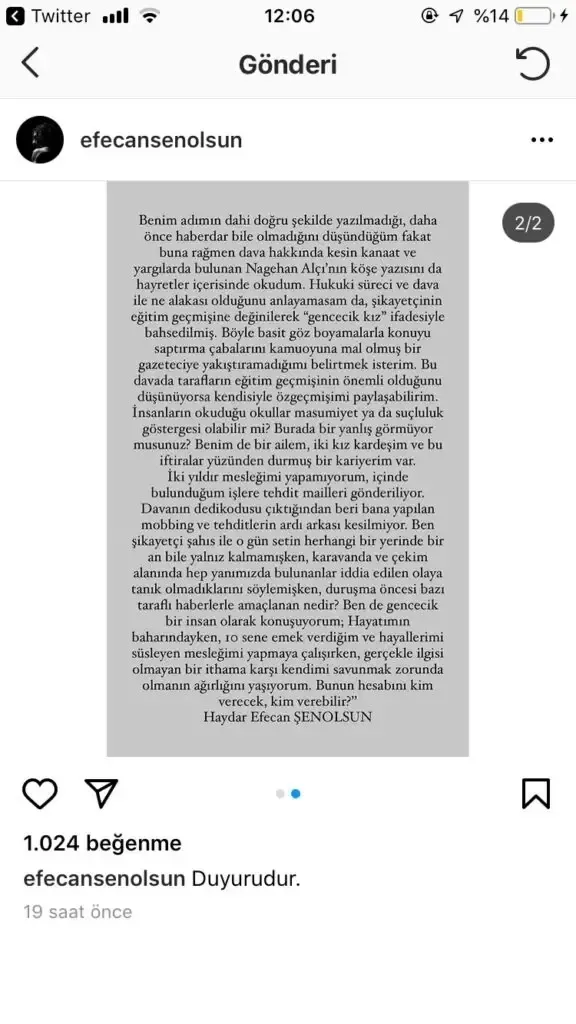 Dava öncesi oyuncu Efecan Şenolsun sosyal medya üzerinden bir açıklama yaptı. Şenolsun açıklamasında, "Duruşma öncesi kamuoyunu aldatmaya, mahkemeyi etkilemeye yönelik yalan beyanlara dayalı tek taraflı haber ve yorumlar yapıldığını görüp daha fazla sessiz kalmama kararı aldım. Bu kadın erkek tarafı olacak bir duruşma değil. İki samimi çalışma arkadaşının tartışmalarının sonradan çarptırılarak yargıya taşınmasıdır. Söz konusu davada bizim tarafımızdan 11 kişi görgü tanığı olarak dinletilmiş, hepsi sette iddia konusu olayı görmediğini söylemiştir. Ben de gencecik bir insan olarak konuşuyorum. Hayatımın baharındayken 10 sene emek verdiğim ve hayallerimi süsleyen mesleğimi yapmaya çalışırken gerçekle ilgisi olmayan bir ithama karşı kendimi savunmak zorunda olmanın ağırlığını yaşıyorum. Bunun hesabını kim verecek?"