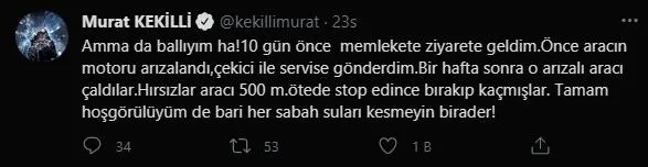 Aracının çalınması ve geri bulunmasına Twitter hesabından yaptığı paylaşımla tepki veren Kekilli, "Amma da ballıyım ha! 10 gün önce memlekete ziyarete geldim. Önce aracın motoru arızalandı, çekici ile servise gönderdim.