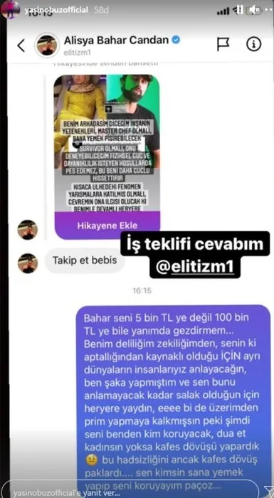 "Bahar seni 5 bin TL'ye değil 100 bin TL'ye bile yanımda gezdirmem. Benim deliliğim zekiliğimden seninki aptallığından kaynaklı olduğu için ayrı dünyaların insanlarıyız anlayacağın. Ben şaka yapmıştım ve sen bunu anlamayacak kadar salak olduğun için her yere yaydın, ee bir de üzerimden prim yapmaya kalkmışsın peki şimdi seni benden kim koruyacak? Dua et kadınsın yoksa kafes dövüşü yapardık. Bu hadsizliğini ancak kafes dövüşü paklardı…Sen kimsin sana yemek yapıp seni koruyayım paçoz"