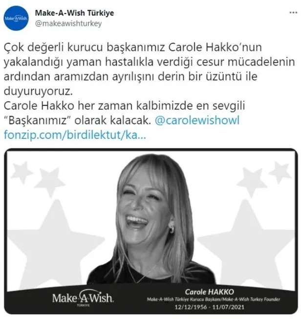 Kanser hastası çocukların dileklerini yerine getirmek için kurulan "Bir Dilek Tut-Make A Wish" derneğinin başkanı Carole Hakko, pankreas kanserine yenilerek hayatını kaybetti. Dün sabah vefat eden Hakko, tüm sevenlerini yasa boğarken, dostları sosyal medyada birbiri ardına paylaşımlar yaparak üzüntülerini bildirdi.