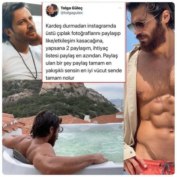 Tolga Güleç, "Kardeş durmadan Instagram'da üstü çıplak fotoğraflarını paylaşıp like/etkileşim kasacağına, yapsana 2 paylaşım, ihtiyaç listesi paylaş en azından. Paylaş ulan bir şey paylaş. Tamam en yakışıklı sensin, en iyi vücut sende tamam..." diyerek meslektaşına ateş püskürdü.