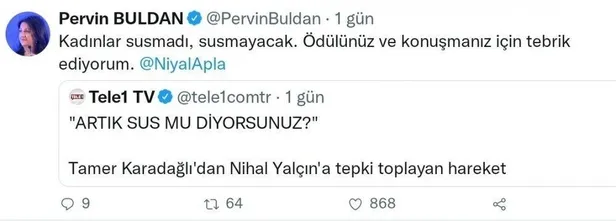 HDP Eş Genel Başkanı Pervin Buldan, Antalya Altın Portakal Film Festivali'nde Tamer Karadağlı'nın ödül konuşması yapan oyuncu Nihal Yalçın'a olan tavrı nedeniyle sosyal medya hesabından destek mesajı yayımladı. Yalçın'a destek veren Buldan, "Kadınlar susmadı, susmayacak. Ödülünüz ve konuşmanız için tebrik ediyorum" ifadelerini kullandı.