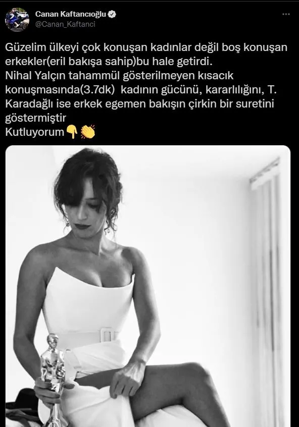 Antalya Altın Portakal'da 'En İyi Kadın Oyuncu' ödülünü alan Nihal Yalçın ile ödülü takdim etmek için sahneye çıkan Tamer Karadağlı arasında yaşanan diyalog, sosyal medyada gündem oldu. Yalçın, ödül töreni sonrası sosyal medya hesabından paylaşım yaparak, "Lütfen Tamer'in önüme geçmesine izin vermeyin. Bu gece benim gecem." dedi. Yalçın'a sosyal medya üzerinden oyuncu ve siyasi isimlerden destek verildi.