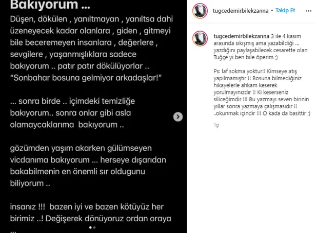 Daha önce de imalı paylaşım yaptığı iddia edilen Tuğçe Demirbile Zanna, yaptığı paylaşımda şu ifadeleri kullandı:
