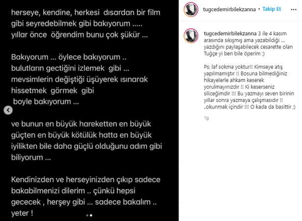 Tuğçe Demirbilek bu paylaşımına şu not da ekleyerek, yazdıklarının boşanma aşamasındaki eşi Danilo Zanna hakkında olmadığını da vurguladı: