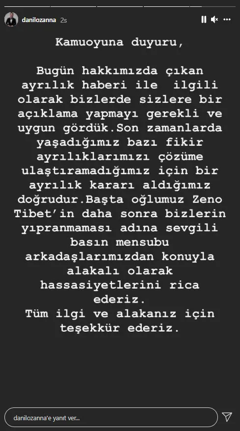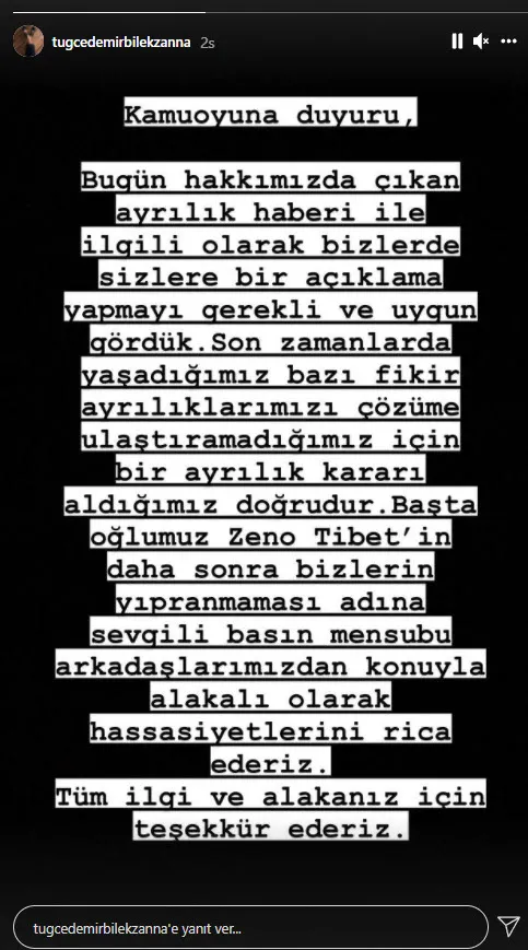 Çift sosyal medya hesaplarından yaptıkları paylaşımda, "Kamuoyuna duyuru... Bugün hakkımızda çıkan ayrılık haberi ile ilgili bir açıklama yapmayı gerekli ve uygun gördük. Son zamanlarda yaşadığımız bazı fikir ayrılıklarımızı çözüme ulaştıramadığımız için bir ayrılık kararı aldığımız doğrudur. Başta oğlumuz Zeno Tibet'in daha sonra bizlerin yıpranmaması adına sevgili basın mensubu arkadaşlarımızdan konuyla alakalı olarak hassasiyetlerini rica ederiz. Tüm ilgi ve alakanız için teşekkür ederiz." diyerek haberleri doğrulamıştı.