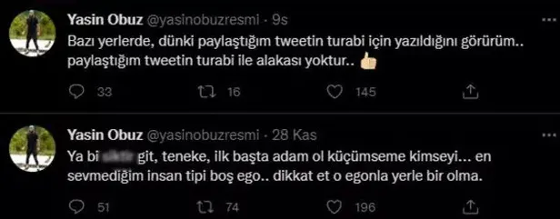 Yasin Obuz "Ya bi s..ir git, teneke, ilk başta adam ol küçümseme kimseyi... En sevmediğim insan tipi boş ego.. Dikkat et o egonla yerle bir olma" paylaşımı yaptı.