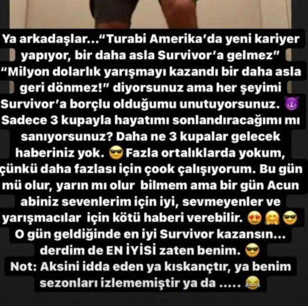 Turabi paylaşımında şunları söyledi: "Her şeyimi Survivor'a borçlu olduğumu unutuyorsunuz. Sadece 3 kupayla hayatımı sonlandıracağımı mı sanıyorsunuz? Daha ne 3 kupalar gelecek haberiniz yok. Fazla ortalıkta yokum çünkü daha fazlası için çok çalışıyorum.Bugün mu olur yarın mı olur bilmem ama bir gün Acun abiniz sevenlerim için iyi sevmeyenler ve yarışmacılar için kötü haberi verebilir. O gün geldiğinde en iyi Survivor kazansın."