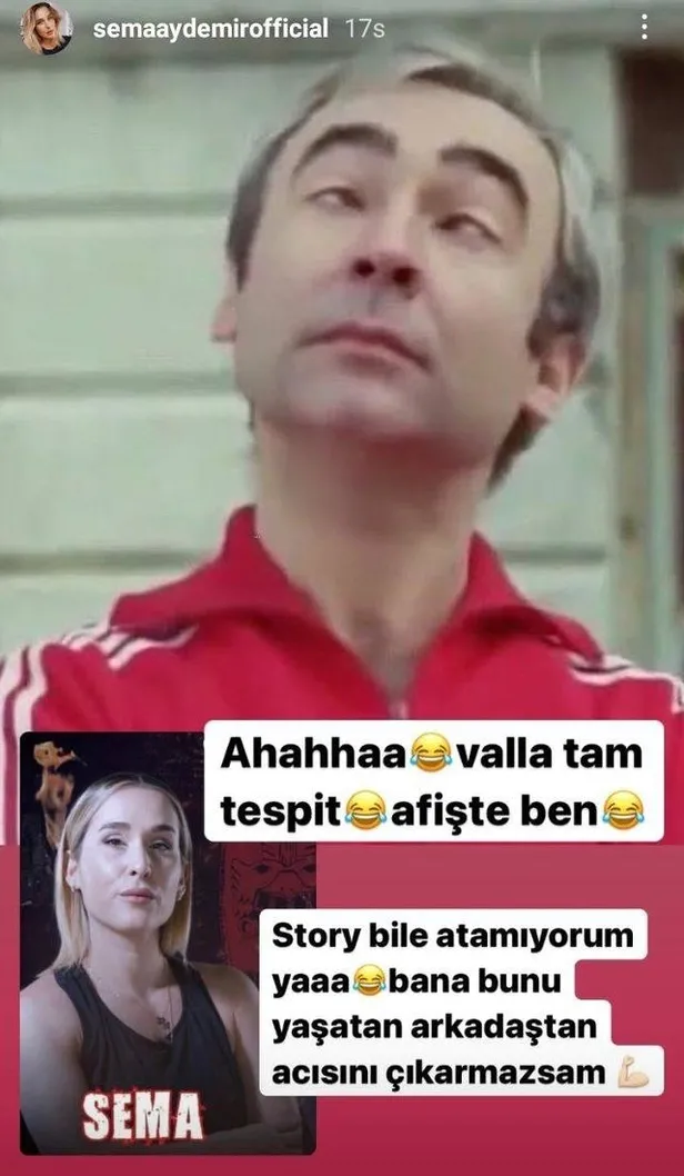 Sosyal medya kullanıcıları tarafından Şener Şen'e benzetilen Aydemir, ''Tam tespit. Afişte ben. Story bile atamıyorum ya! Bana bunu yaşatan arkadaştan acısını çıkarmazsam...'' notunu düştü.
