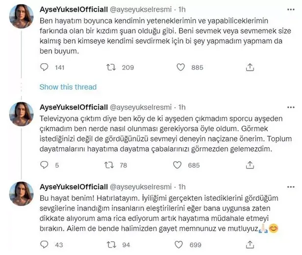 Özel hayatına dair yapılan yorumlar karşısında sessizliği bozan Yüksel, ''Televizyona çıktım diye köydeki Ayşe'den çıkmadım. Görmek istediğinizi değil de gördüğünüzü sevmeyi deneyin. Toplum dayatmalarını hayatıma dayatma çabalarınızı görmezden gelemezdim. Bu hayat benim! Rica ediyorum artık hayatıma müdahale etmeyi bırakın. Ailem de ben de halimizden gayet memnunuz ve mutluyuz'' ifadelerini kullanmıştı.