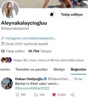 Aleyna Kalaycıoğlu, Survivor Panorama yorumcularından Hakan Hatipoğlu'nun, Batuhan ile Berkan arasında yaşanan kavga sonrası attığı 'Berkan'a Allah sabır versin...' paylaşımını beğendi. Kalaycıoğlu'nun bu hamlesi sosyal medyanın gündemine bomba gibi düşerken, yarışma boyunca arasından su sızmadığı Batuhan ile tamamen koptuklarını bir kez daha gözler önüne sermiş oldu.