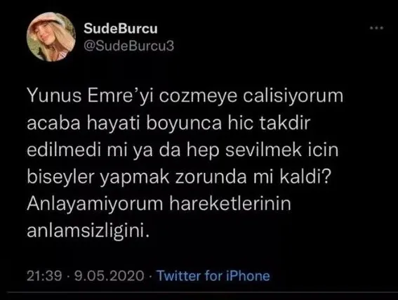 Yunus Emre Özden'in, tepki çeken sözlerini, Survivor eski yarışmacısı Sude Burcu için söylediği öne sürüldü. İddiaya göre Yunus Emre Özden, Sude Burcu'nun 2020 yılında kendisi hakkında attığı tweetlere öfkelenmişti.