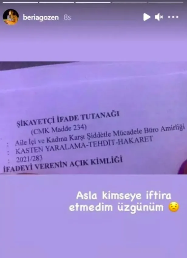 Gözen, Özden'in kendisini darp etmesinden sonra karakola gidip şikayetçi oldu. Ardından da şu storyi paylaştı Berisa Gözen:
