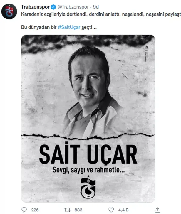 Trabzonspor Kulübü de sosyal medya hesabından yaptığı paylaşımda "Karadeniz ezgileriyle dertlendi, derdini anlattı; neşelendi, neşesini paylaştı. Bu dünyadan bir #SaitUçar geçti" ifadelerini kullandı.