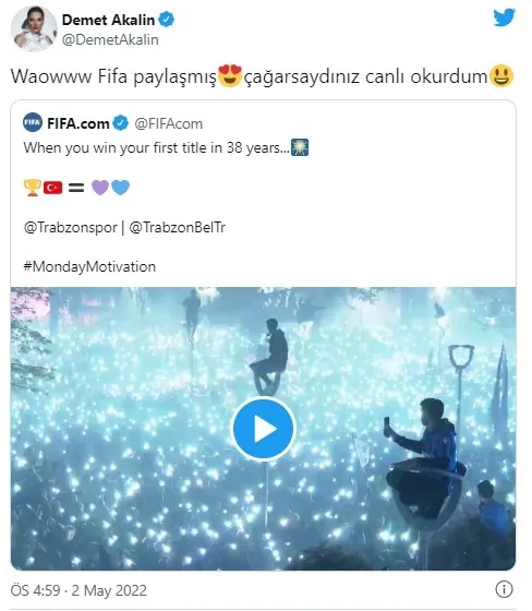 Trabzonspor'un 2021-22 sezonunda ulaştığı şampiyonluk dünyada ses getirmeye devam ediyor. 81 ilde yapılan kutlamaların görkemi ülke sınırlarını aştı, tüm dünyada yankılandı. Şehir merkezinde Trabzon Büyükşehir Belediyesi tarafından organize edilen şampiyonluk kutlamalarındaki tekno parti büyük ses getirdi. Trabzonspor'un şampiyonluğu, sanat dünyasında da coşkuyla kutlandı. Ünlüler, yaptıkları paylaşımlarla milyonlarca bordo mavilinin sevincine ortak oldu. Demet Akalın, Kulüp şarkısı eşliğinde coşan taraftara, "Çağırsaydınız gelir canlı okurdum" diye seslendi. İşte Demet'in ve diğer ünlülerin Trabzonspor coşkusu...