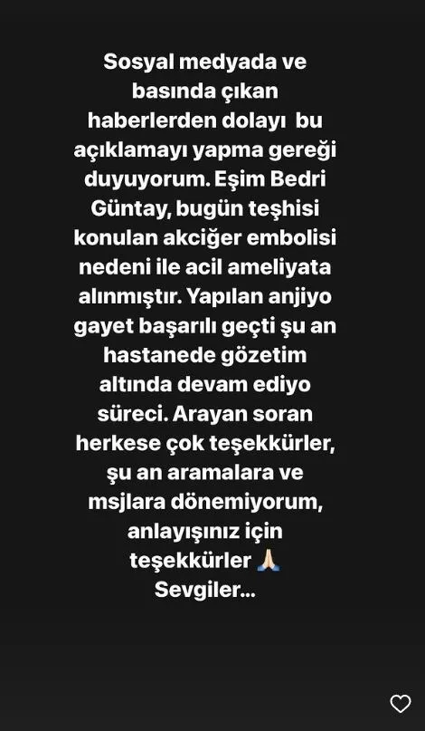 Tüm bunların ardından Pelin Karahan, sosyal medya hesabında eşinin sağlık durumuyla ilgili paylaşımda bulundu.