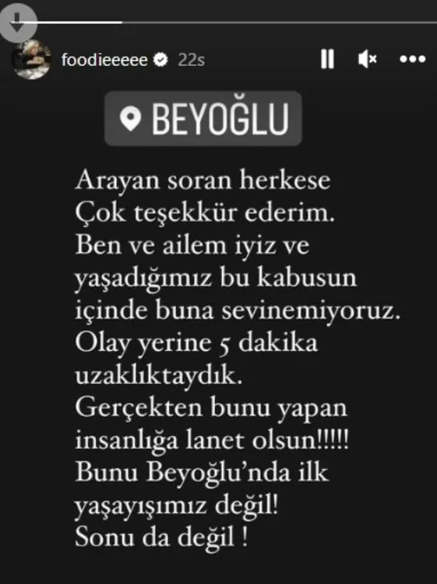 Burcu Önal, ''Ben ve ailem iyiyiz ve yaşadığımız bu kabusun içinde buna sevinemiyoruz. Olay yerine 5 dakika uzaklıktaydık. Gerçekten bunu yapan insanlığa lanet olsun! Bunu Beyoğlu'ndaki ilk yaşayışımız değil, sonu da değil.'' dedi.