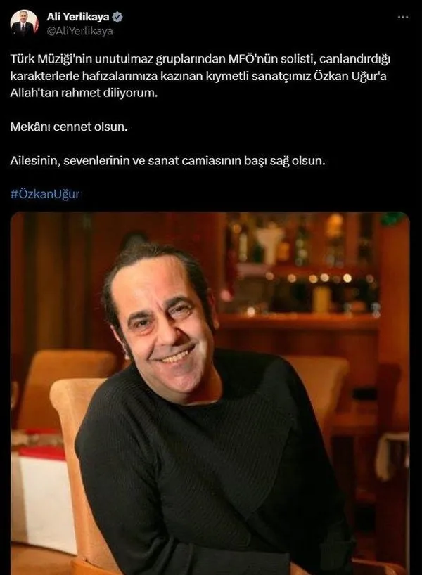 Yerlikaya, "Türk Müziği'nin unutulmaz gruplarından MFÖ'nün solisti, canlandırdığı karakterlerle hafızalarımıza kazınan kıymetli sanatçımız Özkan Uğur'a Allah'tan rahmet diliyorum. Mekânı cennet olsun. Ailesinin, sevenlerinin ve sanat camiasının başı sağ olsun." dedi.