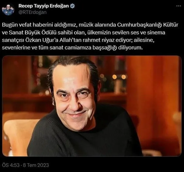 Başkan Erdoğan, İstanbul'da bir süredir yoğun bakım ünitesinde tedavi gören ve 69 yaşında yaşamını kaybeden sanatçı Özkan Uğur için sosyal medya hesabından paylaştığı başsağlığı mesajında şu ifadelere yer verdi: