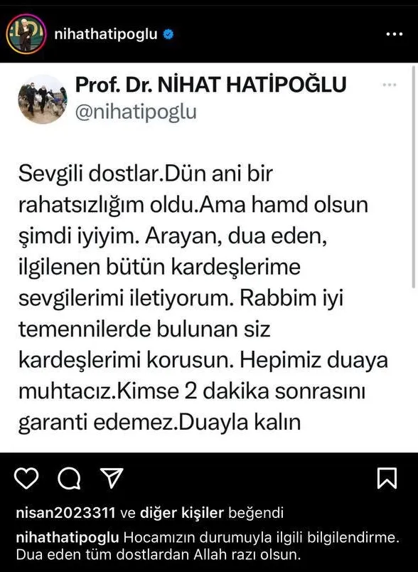 Hatipoğlu'nun sosyal medya hesabından yapılan açıklamada, "Nihat hocamız tansiyon sebebiyle hastanede şuan tedavi görmekte. Sizlerden hocamız için dua talep ediyoruz" ifadeleri kullanıldı.
