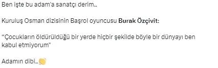 "Ben işte bu adama sanatçı derim.. Kuruluş Osman dizisinin başrol oyuncusu Burak Özçivit: "Çocukların öldürüldüğü bir yerde hiçbir şekilde böyle bir dünyayı kabul etmiyorum"