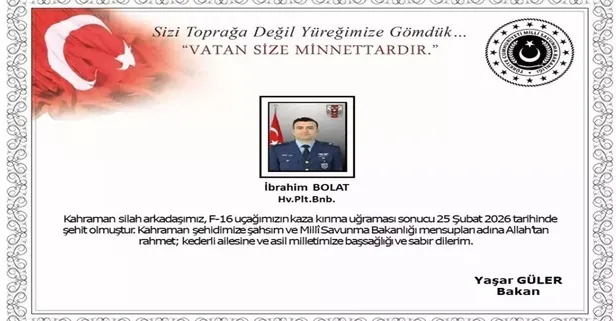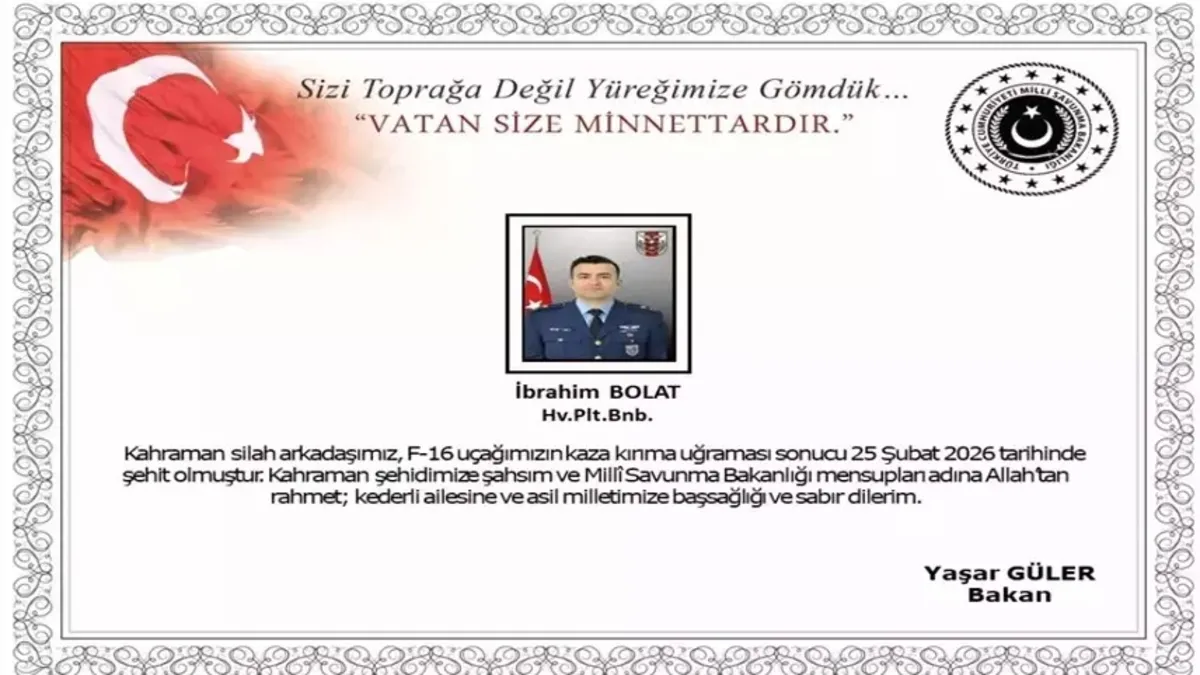 Balıkesir'de görev uçuşu sırasında düşen F-16 savaş uçağında şehit olan Hava Pilot Binbaşı İbrahim Bolat'ın acı haberi Türkiye'yi yasa boğdu.