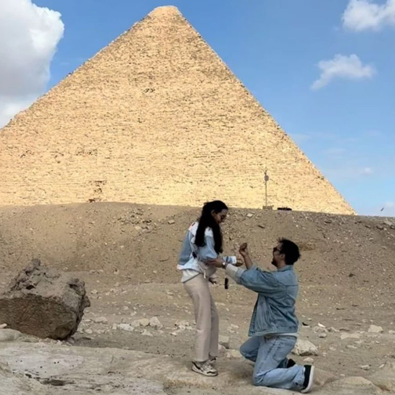 Teklif, çiftin birlikte gittiği Mısır seyahati sırasında tarihi piramitlerin önünde gerçekleşmiştir.