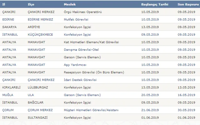 İŞKUR 'da yayımlanan mesleki ve işbaşı eğitim kursları şu şekilde;