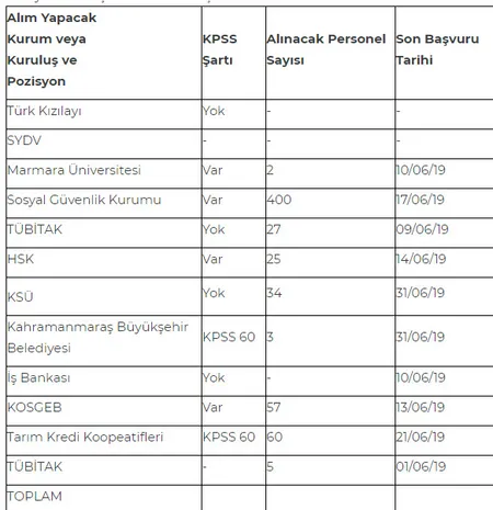 2019 Haziran ayı kamu KPSS'li KPSS şartsız son dakika memur, işçi ve kamu personel alımı başvuru şartları nedir? Haziran ayı için yeni memur işçi ve personel alımı ilanları yayımlanarak binlerce kişilik kadro ile alım yapılacağı ilan edildi. İşte Haziran ayı alımları. Haziran ayı başında çok sayıda kurum ilan yayımladı. Bunlardan belli başlı olanları, Türk Kızılayı, Sosyal Yardımlaşma ve Dayanışma Vakıfları, Çeşitli Üniversiteler, Belediyeler, Sosyal Güvenlik Kurumu, TÜLOMSAŞ, Tarım ve Orman Bakanlığı, İş Bankası, tarım Kredi Kooperatifleri, KOSGEB, TÜBİTAK gibi kurumlar bünyelerine alım yapacaklarını ilan ettiler.
