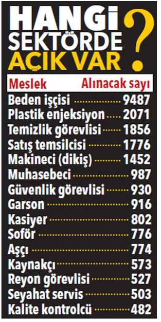 Sadece vasıflı vasıfsız işçi alımı ve temizlik personeli alımı olarak toplamda 10 bin 463 personel alımı yapılacaktır. Diğer meslek gurupları toplamında ise sadece Haziran ayı içerisinde toplamda 46 bin personel alımı yapılması planlanmaktadır.