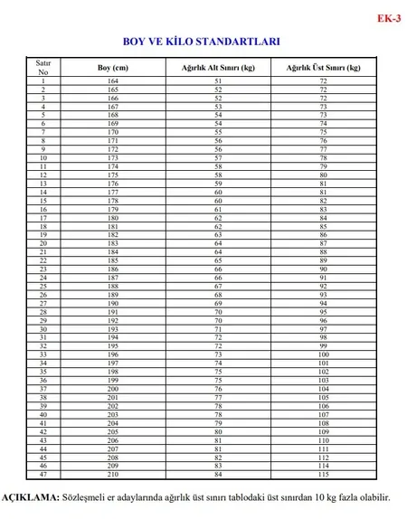(12)Boy ve kilo standartları tablosunda (Ek-3) belirtilen değerler içerisinde bulunmak (Sözleşmeli er adaylarında ağırlık üst sınırı tablodaki üst sınırdan 10 kg fazla olabilir.),