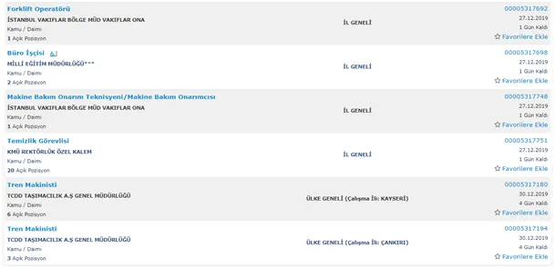 İŞKUR üzerinden yayınlana yeni ilanlarda kamu kurumlarına da alımlar gerçekleştirilmekte olup bu doğrultuda 27 Aralık 2019 itibari ile yayınlanan bazı ilanlar ve detaylar şu şekildedir:
