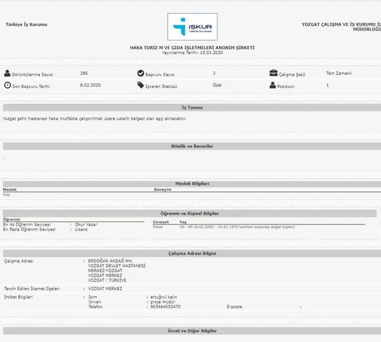 İŞKUR üzerinden yayımlanan personel alım ilanında adayların aşçı olarak görevlendirileceği ifade edildi.