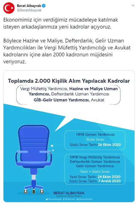Hazine ve Maliye Bakanı Berat Albayrak sosyal medya hesabından "Ekonomimiz için verdiğimiz mücadeleye katılmak isteyen arkadaşlarımıza yeni kadrolar açıyoruz." müjdesini verdi.