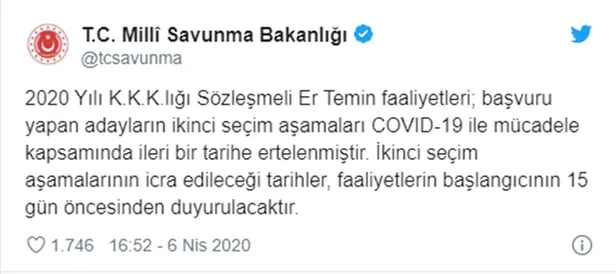 Milli Savunma Bakanlığının Twitter hesabından yapılan paylaşıma göre, sözleşmeli erlik için başvuruda bulunan adayların ikinci seçim aşamaları ileri bir tarihte yapılacak.