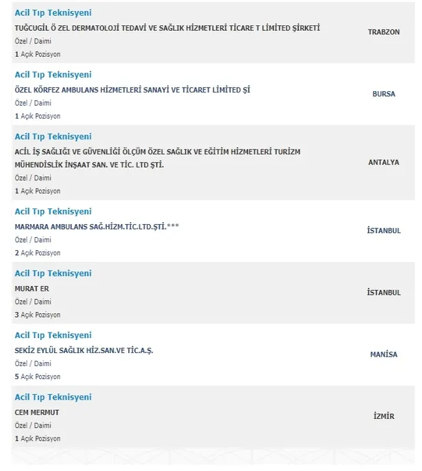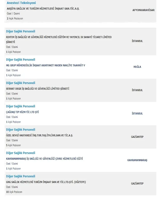 İŞKUR üzerinden yayınlanan duyurularda en az ilkokul mezunu olmak şartı ile hastanelere personel alımı yapılacağı açıklandı. ATT, Anestezi teknikeri, ambulans şoförü, hemşire, sekreter, hasta danışmanı, yaşlı bakımı elemanı, temizlik personeli, klinik destek elemanı, hasta kayıt kabul görevlisi kadrolarına yapılan personel alımlarında başvuru bilgileri aşağıda bulunmakta