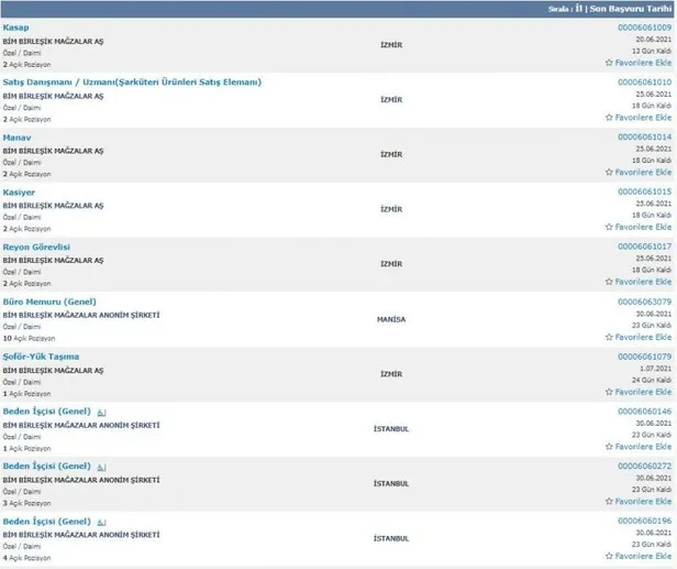 BİM market tarafından personel alımları devam ediyor. BİM marketlerine farklı kadrolarda yapılacak olan alımların başvuru işlemleri Türkiye İş Kurumu üzerinden yapılacaktır. Yayımlanan duyurularda en az ilkokul mezunu adaylar arasından birçok şehre personel alımı yapılacağına yer verildi. Farklı kadrolara yapılan personel alımında başvurular internet üzerinden alınıyor. Öte yandan İŞKUR üzerinden yayımlanan ilanlara baktığımızda Carrefour, Migros ve Şok marketler bünyesinde de personel alımı yapıldığı görüldü.
