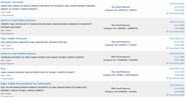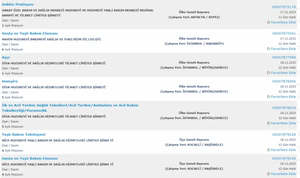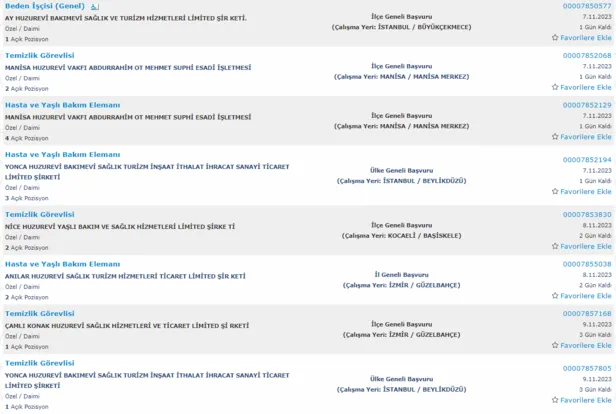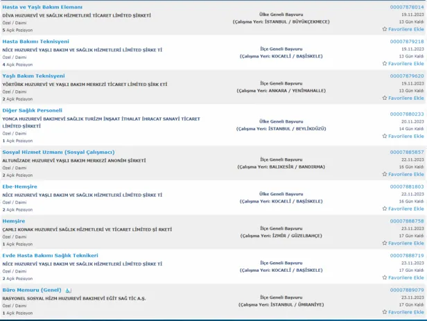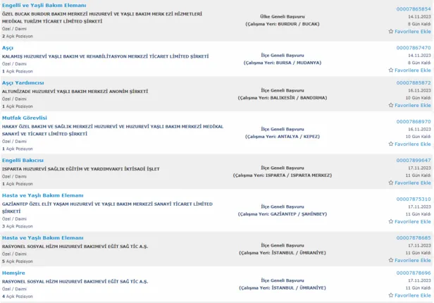 Huzurevlerinde çalışmayı arzulayan adaylar için birçok farklı pozisyon mevcut. İlan edilen kadrolar şu şekildedir: