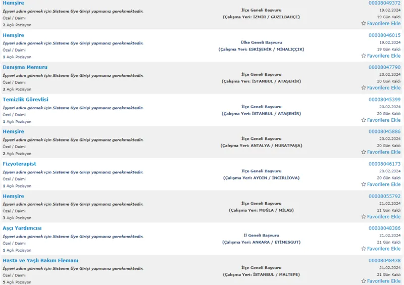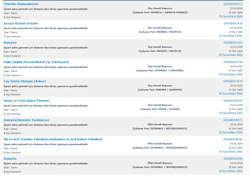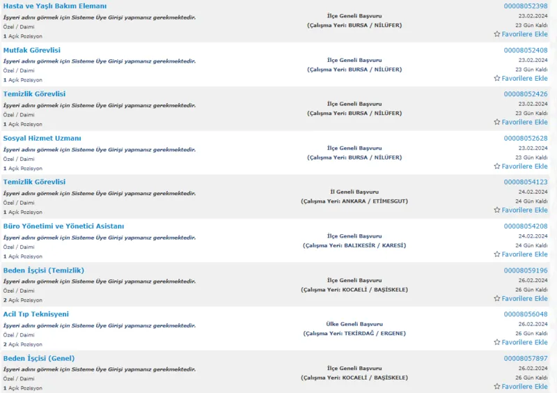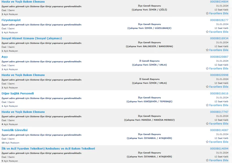 İŞKUR üzerinden yayımlanan ilanlarda çeşitli pozisyonlar için fırsatlar bulunuyor. Bu pozisyonlar arasında hasta ve yaşlı bakım elemanı, fizyoterapist, sosyal hizmet uzmanı, aşçı, diğer sağlık personeli, temizlik görevlisi, ilk ve acil yardım teknikeri/ambulans ve acil bakım teknikeri, yaşlı bakım elemanı, hasta bakıcısı gibi çeşitli meslek dalları yer alıyor. İlanlarda belirtilen şartlar ve çalışma yerleri, pozisyona göre değişiklik gösterebilir.