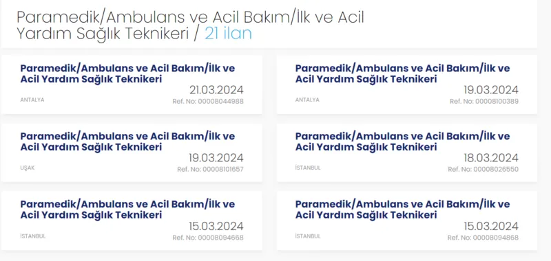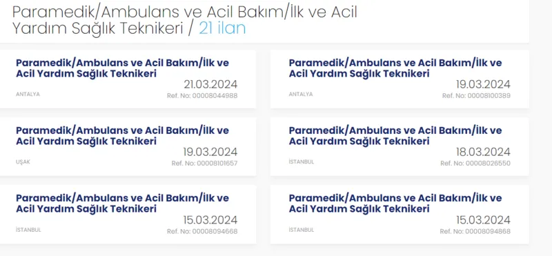 Türkiye genelinde farklı şehirlerdeki Paramedik/Ambulans ve Acil Bakım/İlk ve Acil Yardım Sağlık Teknikeri pozisyonları için açık iş ilanları aşağıda belirtilmiştir. İlanlar tarih sıralamasına göre listelenmiştir: