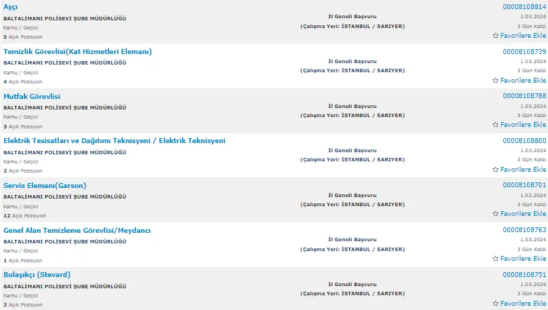 EGM ve okullara KPSS şartsız personel alımları başladı. Baltalimanı Polisevi Şube Müdürlüğü başta olmak üzere, çeşitli pozisyonlarda geçici personel alımı gerçekleştirilecek. İstanbul'da yapılacak olan bu alımlarda, aşçıdan temizlik görevlisine, mutfak personelinden elektrik teknisyenine kadar birçok farklı alanda istihdam sağlanacak. Bu alımlar, özellikle farklı meslek gruplarından iş arayanlar için önemli bir imkan sunuyor.