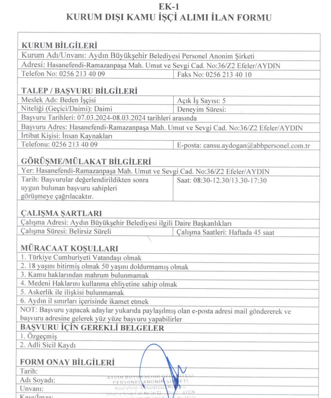 Aydın Büyükşehir Belediyesi tarafından, belediye bünyesine yeni personel katılımı için bir ilan yayınlandı. Belediyenin iştiraki olan Aydın Büyükşehir Belediyesi Personel Anonim Şirketi tarafından yapılan duyuruda, Hasanefendi-Ramazanpaşa Mahallesi, Umutevleri'nde bulunan şirket merkezinde değerlendirilmek üzere yeni ekip arkadaşları arandığı belirtildi.
