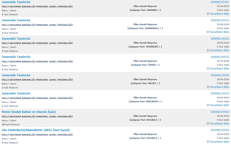 Milli Savunma Bakanlığı İşçi Alımı Meslek ve Şehir Dağılımı