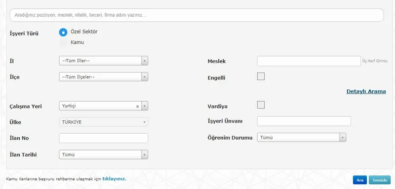 'Meslek' kısmına başvurmak istediğiniz pozisyonun adını yazın ve il seçimi yaparak 'Ara' butonuna tıklayın.